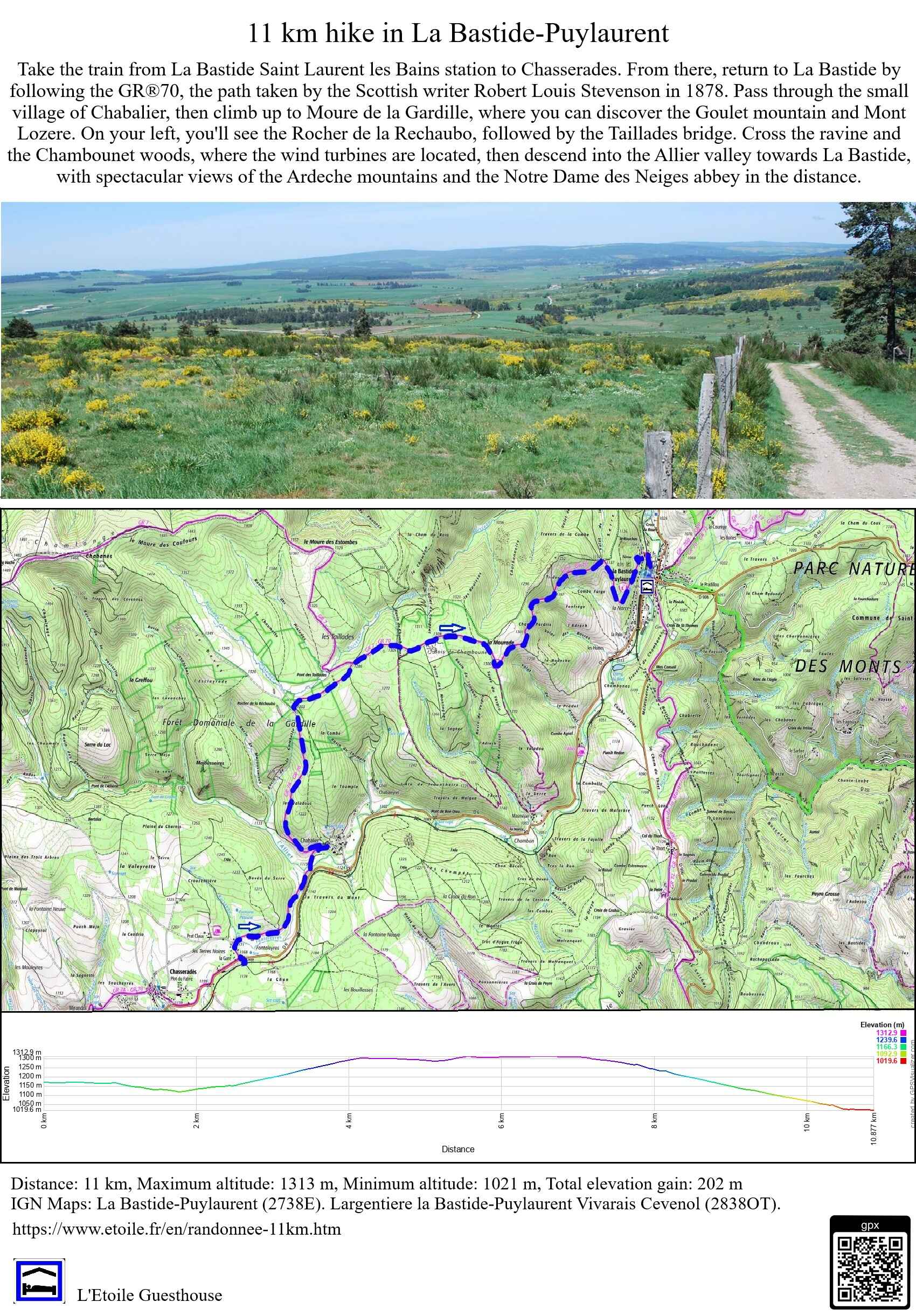 Tomar el tren en la estación de La Bastide Saint Laurent les Bains (Horarios SNCF) hasta Chasseradès. Desde allí, regresar a La Bastide siguiendo el GR®70, camino recorrido por el escritor escocés Robert Louis Stevenson en 1878. Pasar por el pequeño pueblo de Chabalier, luego subir al Moure de la Gardille donde se descubren la montaña del Goulet y el Mont Lozère. A su izquierda, el Rocher de la Réchaubo y luego el puente de Taillades. Pasar el barranco y el bosque de Chambounet donde se encuentran las turbinas eólicas, luego descender al valle del Allier hacia La Bastide con vistas espectaculares frente a usted de las montañas de Ardèche y la abadía Notre Dame des Neiges a lo lejos.