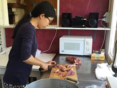 Al final de mi primer año en Francia, llegué a L'Etoile y pasé allí un verano inolvidable. Incluso diría que aprendí más durante estos cuatro meses que en todo un año en la escuela. En este texto, quiero compartir mi experiencia de pasantía para ofrecer a los futuros pasantes una idea de lo que se puede experimentar aquí. Todas las mañanas me levanto temprano para preparar y servir el desayuno a los clientes. Una vez que se han ido, empiezo a limpiar las habitaciones con Philippe: cambio las sábanas, paso la aspiradora y limpio con esponja. Antes de la siesta, almorzamos en la terraza de Françoise, que vive durante la temporada en la pequeña cabaña del jardín, a orillas del río Allier, acompañada de su perrito "Bynti". Es un agradable momento de relax, donde los tres comemos tranquilamente, arrullados por el canto de los pájaros y el relajante sonido del río. Después de la siesta, la tarde la dedicamos a trabajar en internet. Philippe gestiona un sitio que enumera todas las rutas de senderismo de largo recorrido en Francia (www.gr-infos.com). Al mismo tiempo me encargo de dar la bienvenida a los clientes, mostrándoles las habitaciones que tienen reservadas. Por la noche preparo quesos, vino y otros platos para la comida. A las 7:25 p. m., toco el timbre para anunciar la hora de la cena table d'hôte. Cuando hay menos clientes aprovechamos para dar un paseo por los alrededores o hacer algunas compras. Nosotros, por ejemplo, comimos en un restaurante chino en Puy-en-Velay, probamos el delicioso helado en el Auberge du Bez, disfrutamos de un sándwich en Bleymard y hicimos algunas caminatas cortas por las montañas. Philippe, Françoise y yo formamos un equipo muy unido, casi como una familia.